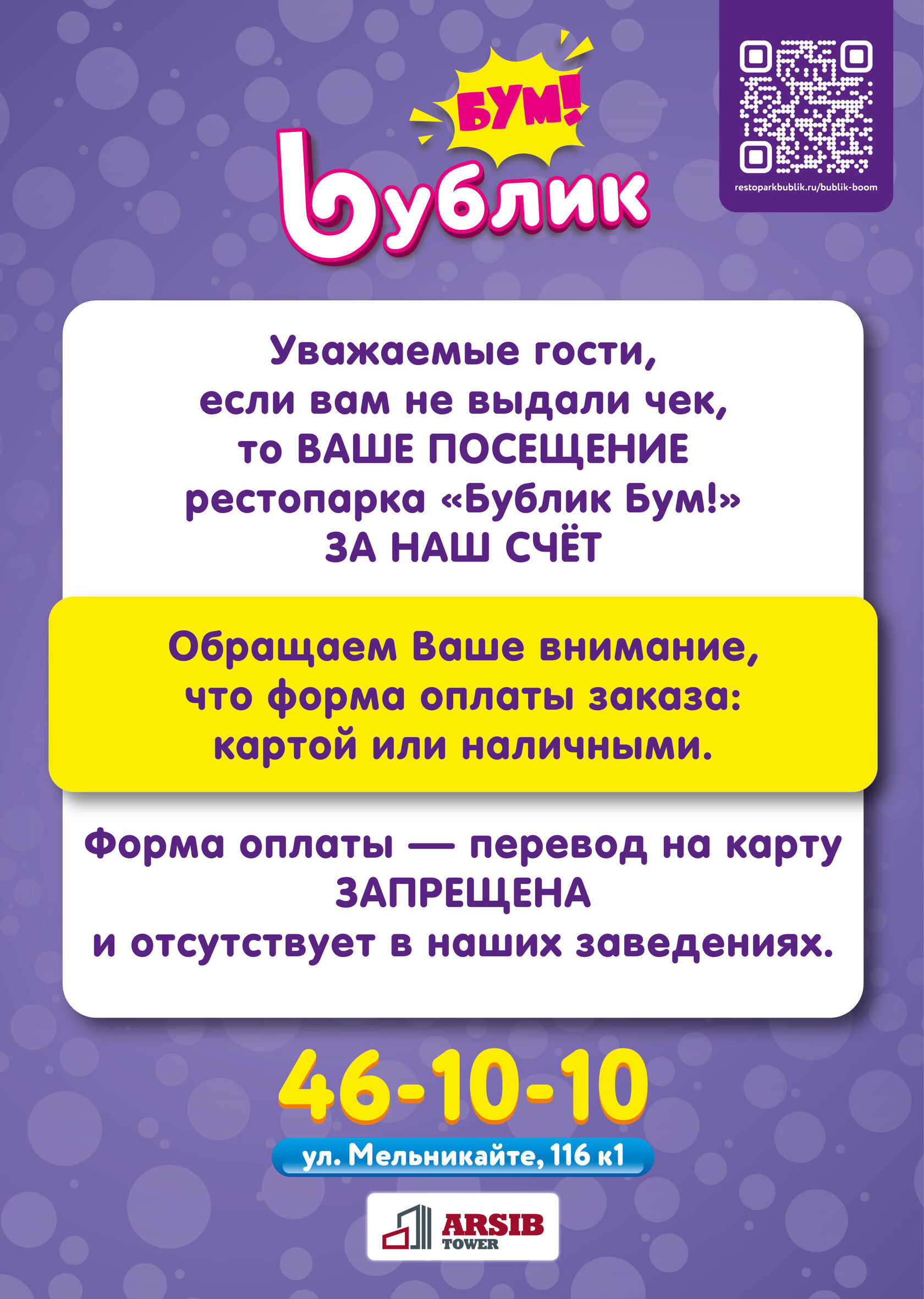 • Переводы на карту — запрещены! Эта форма оплаты отсутствует в наших заведениях. Мы заботимся о вашей безопасности и хотим исключить любые риски, связанные с мошенническими схемами.