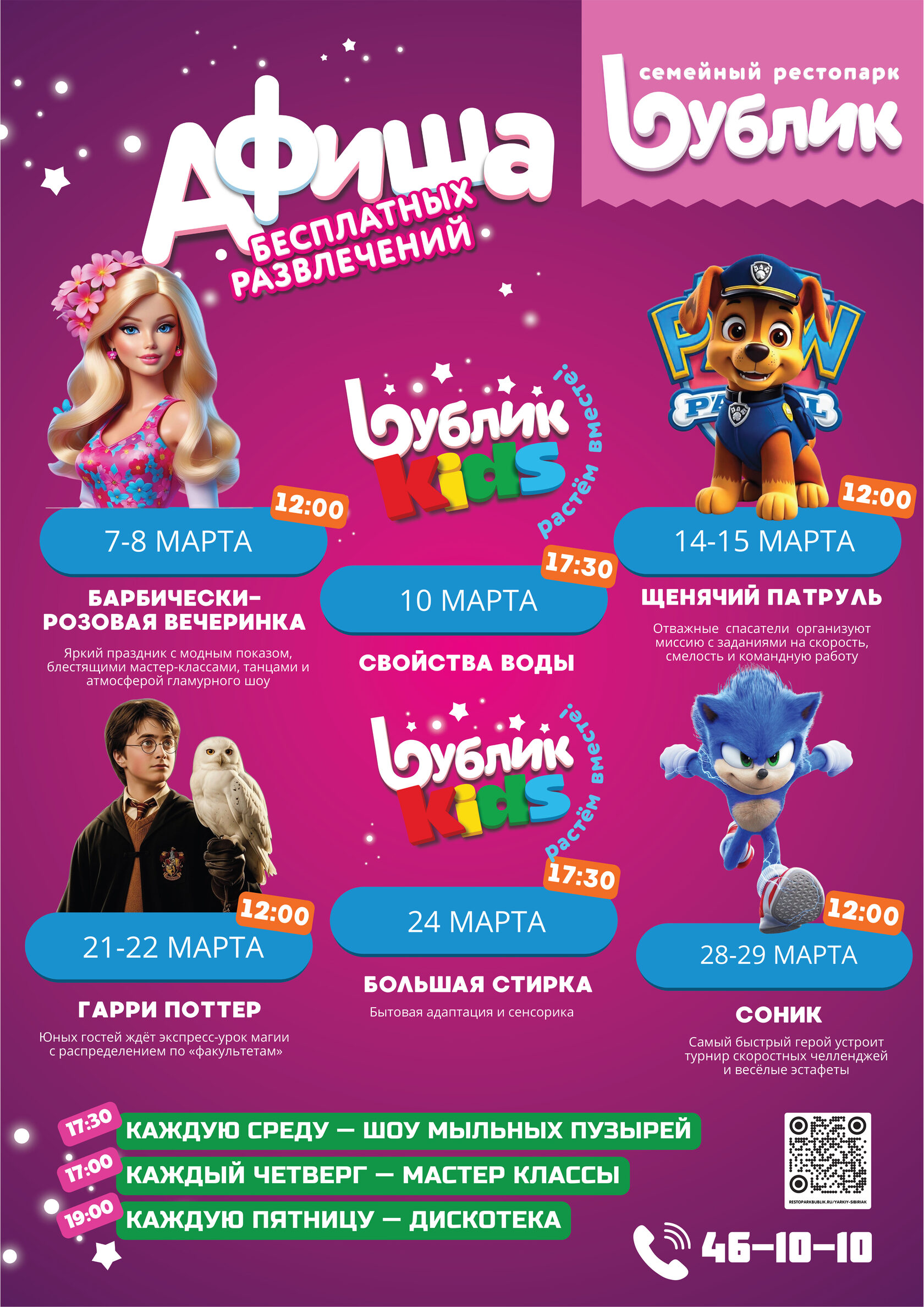 🌟 Афиша бесплатных развлечений в семейном рестопарке «Бублик» — март 2023! 🌟